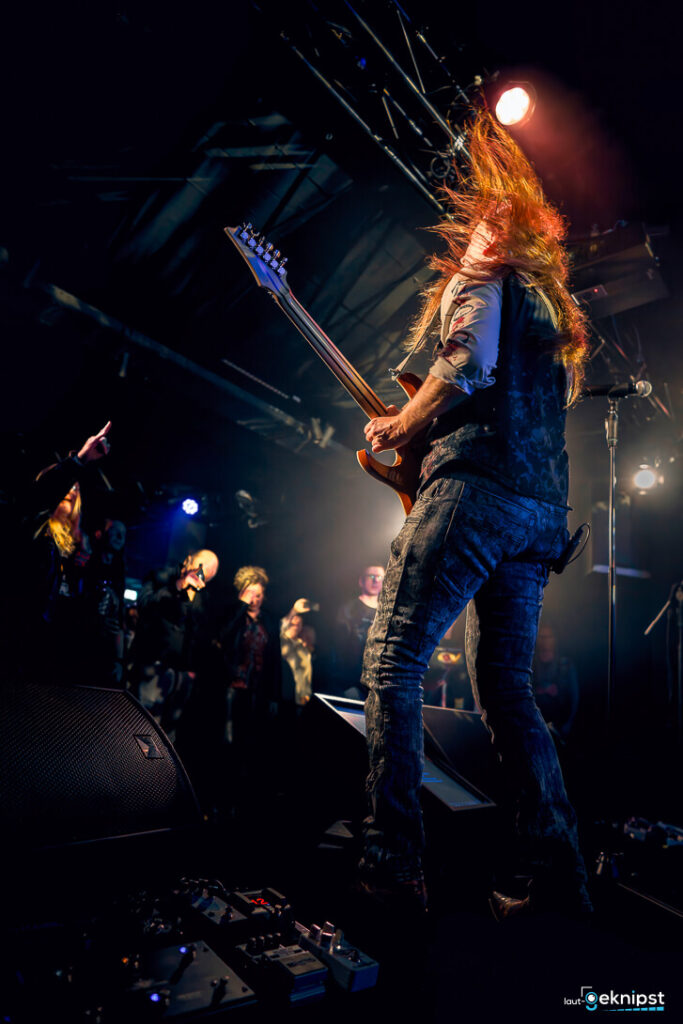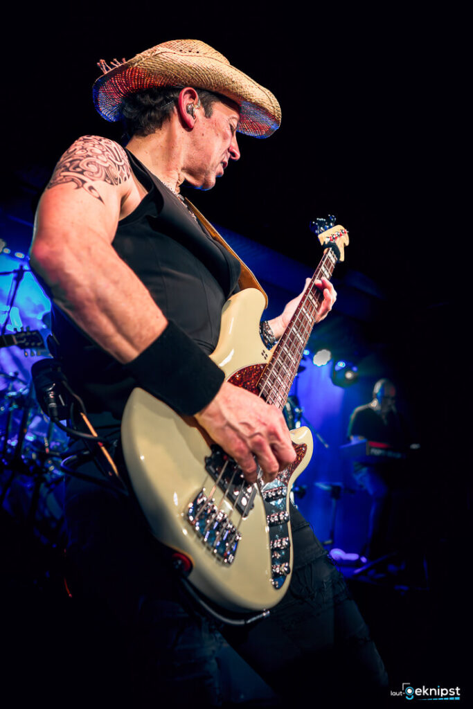 Was gestern in der Turbine besonders auffiel, war die klangliche Architektur. Robert Resinek, ein echter Profi an der Ibanez-Gitarre und erfahrener Gitarren-Coach, lieferte die messerscharfe Präzision, die man für die Ära von Steve Vai oder John Sykes braucht.